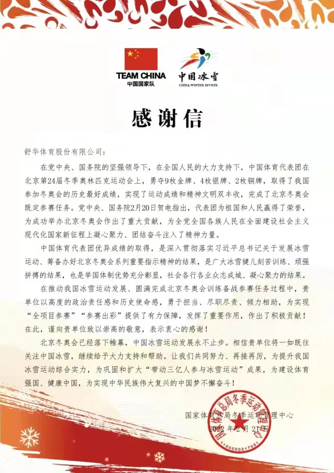 2022 第二十四届冬奥会中国体育代表团感谢信 第二十四届冬奥会中国体育代表团 感谢信 查看